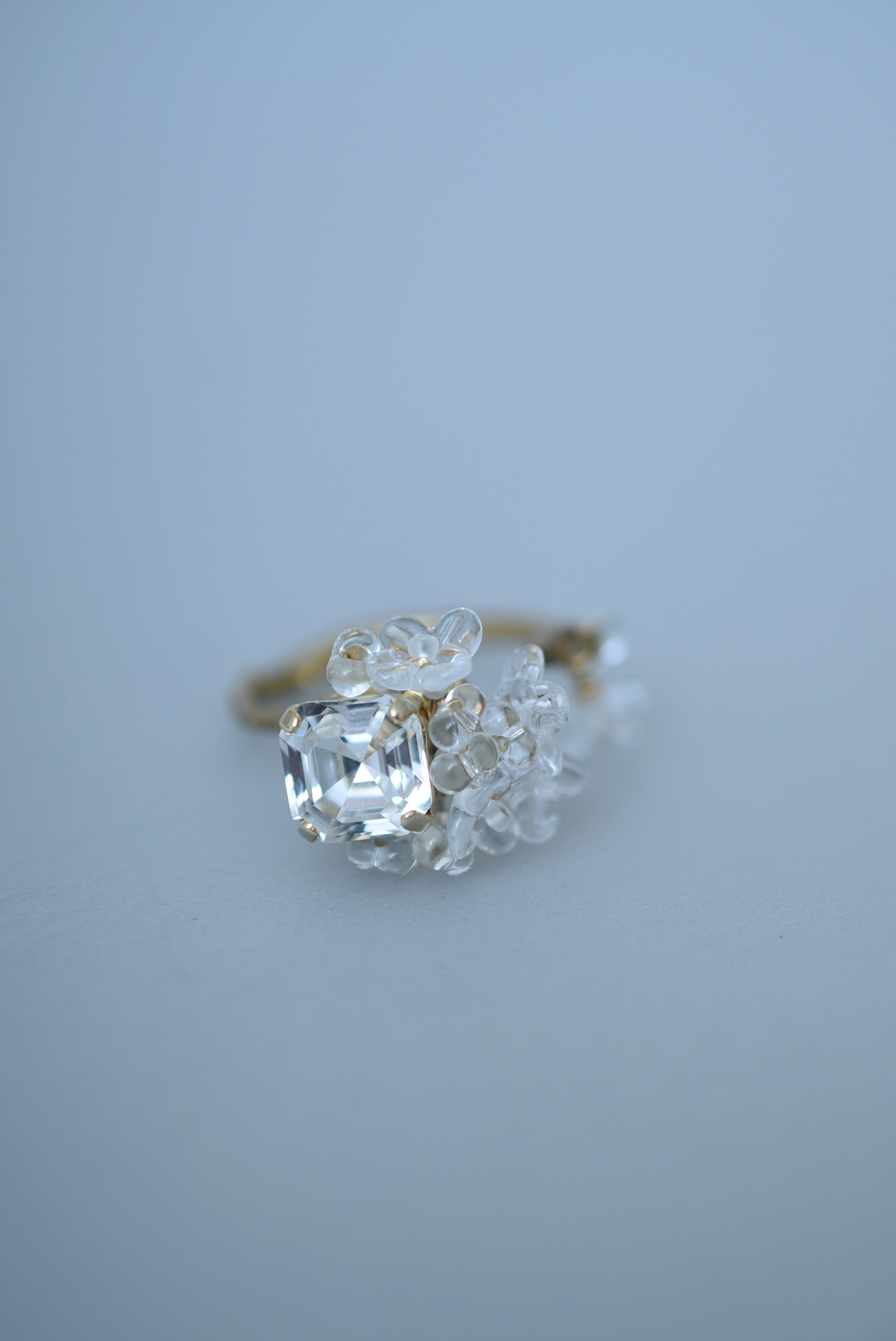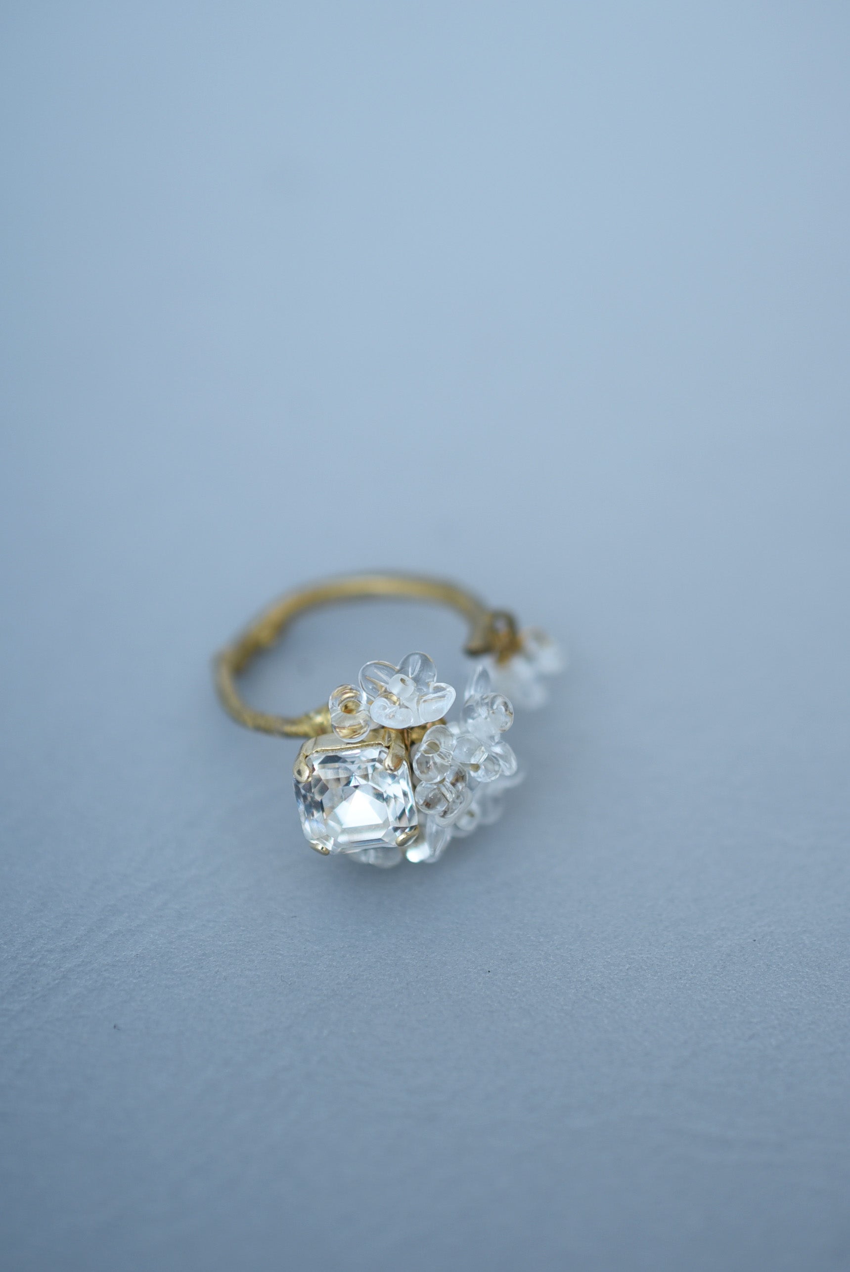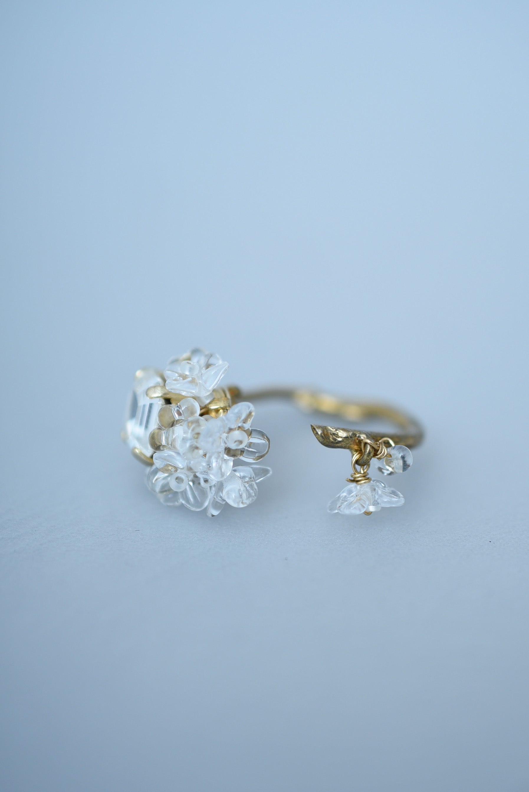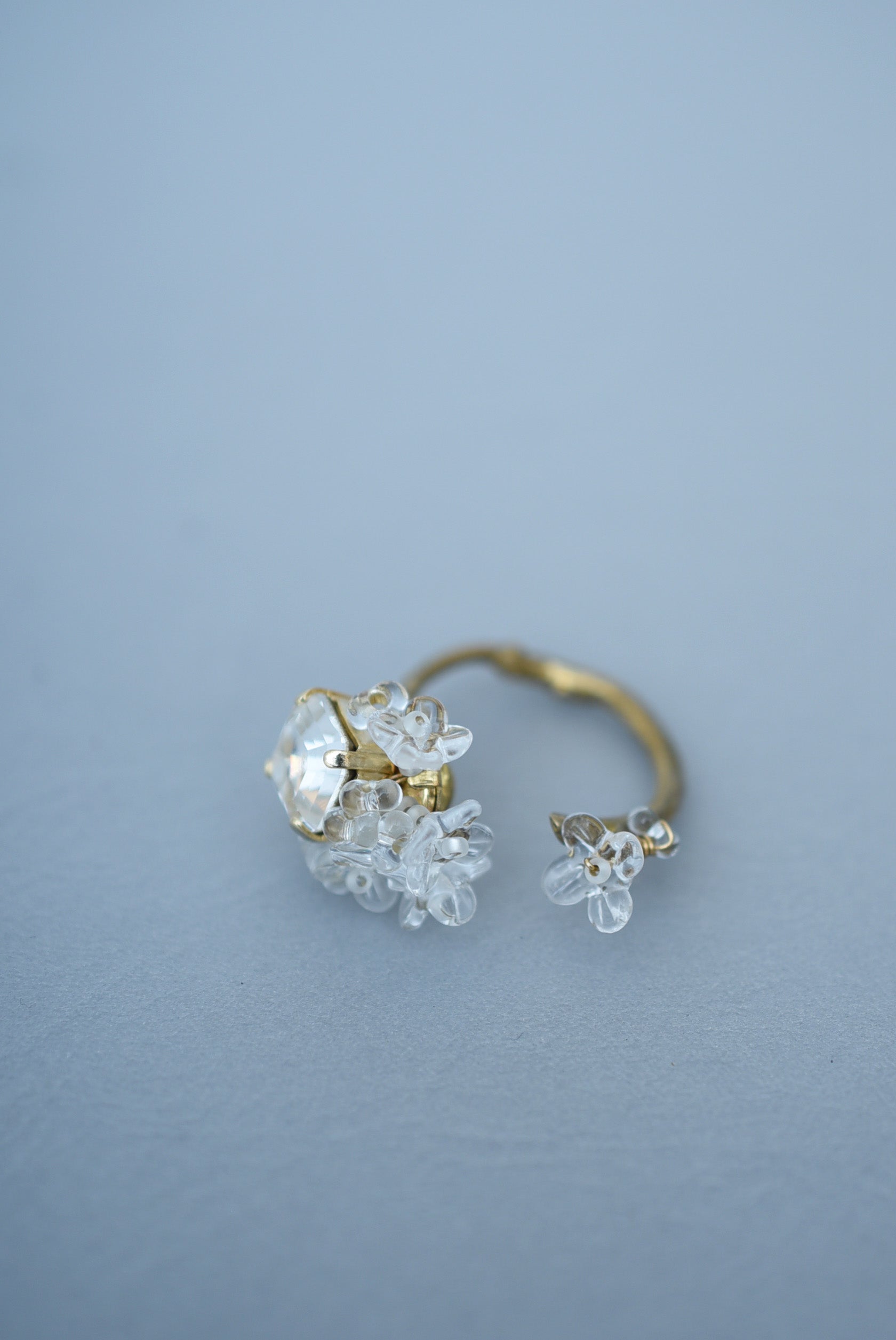 This is an Anabelle Ring. This ring is made with the Western hydrangea, Anabelle, as a motif. Each of these ring parts is very detailed, and it is composed of glass flowers made by glass craftsmen one by one, and very small beads. A single large stone is included, which is Swarovski glass. The center of the ring is open, so you can use it as a free-size ring. You can adjust it to the size of your finger by closing or expanding the ring.