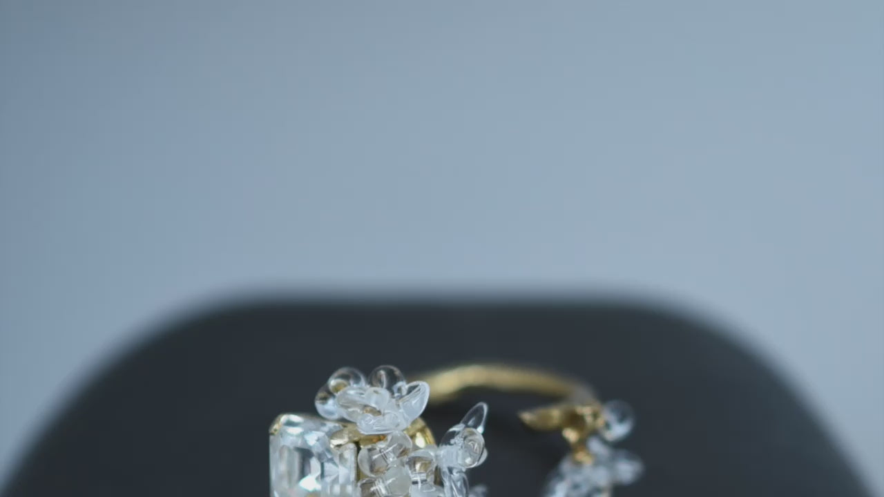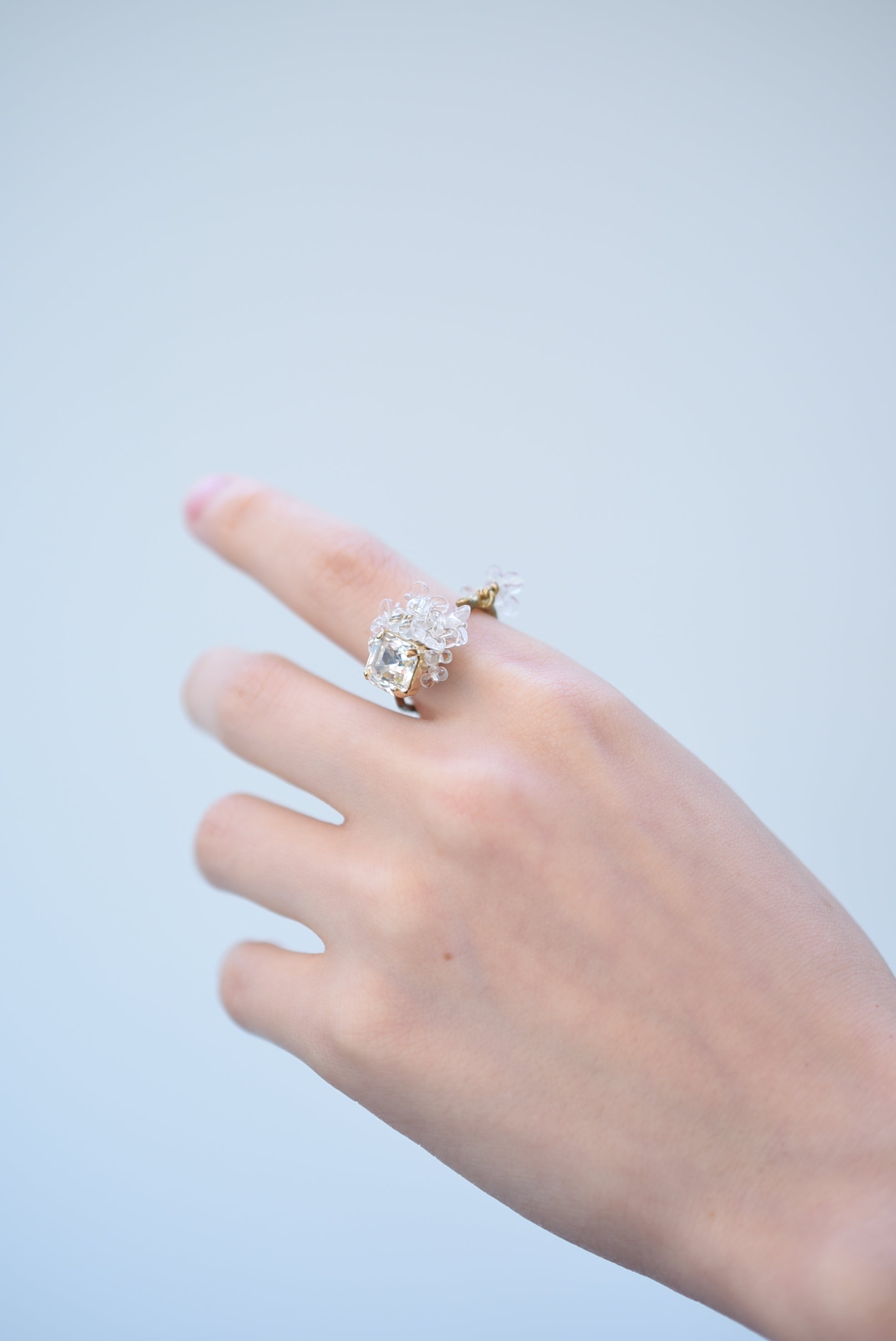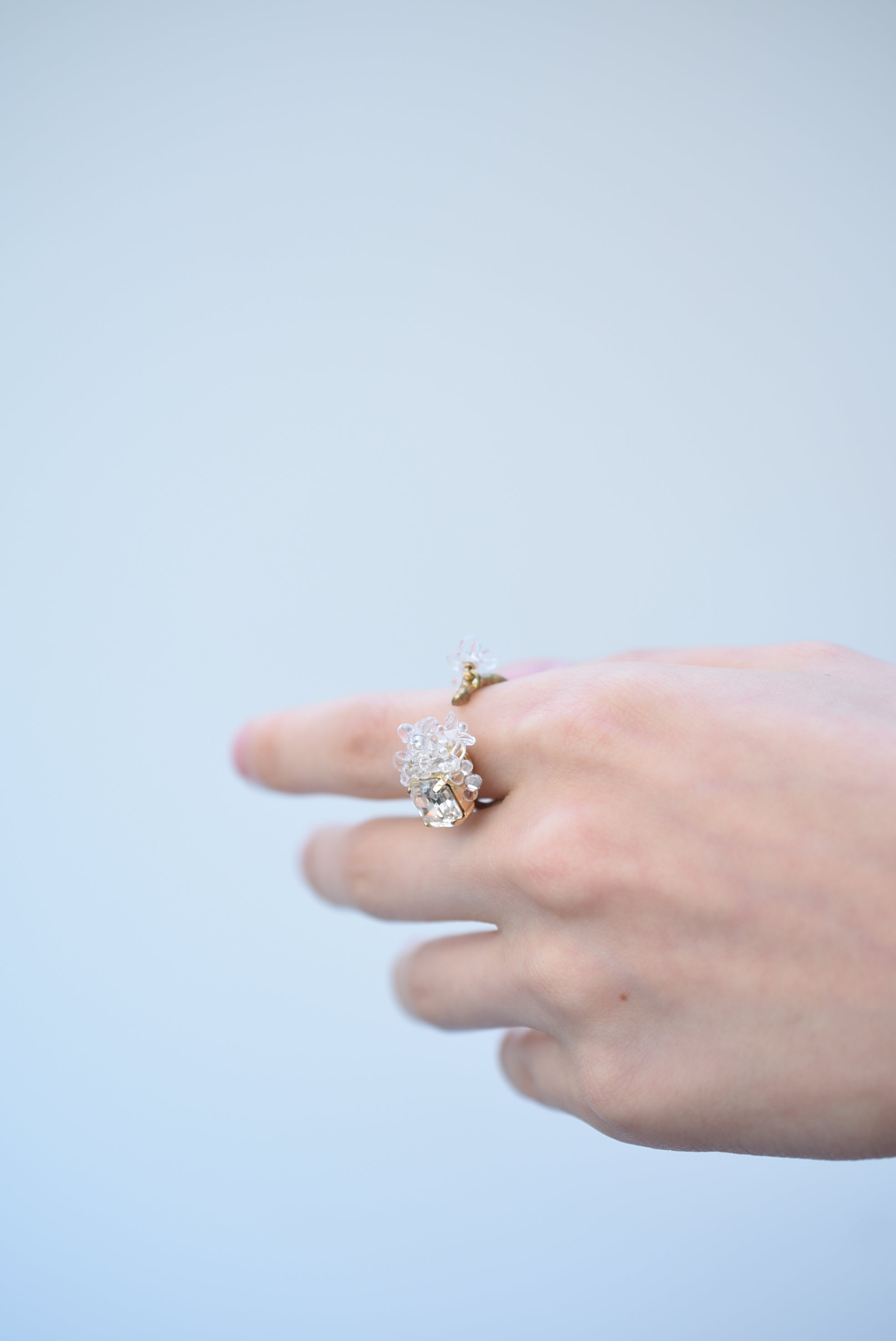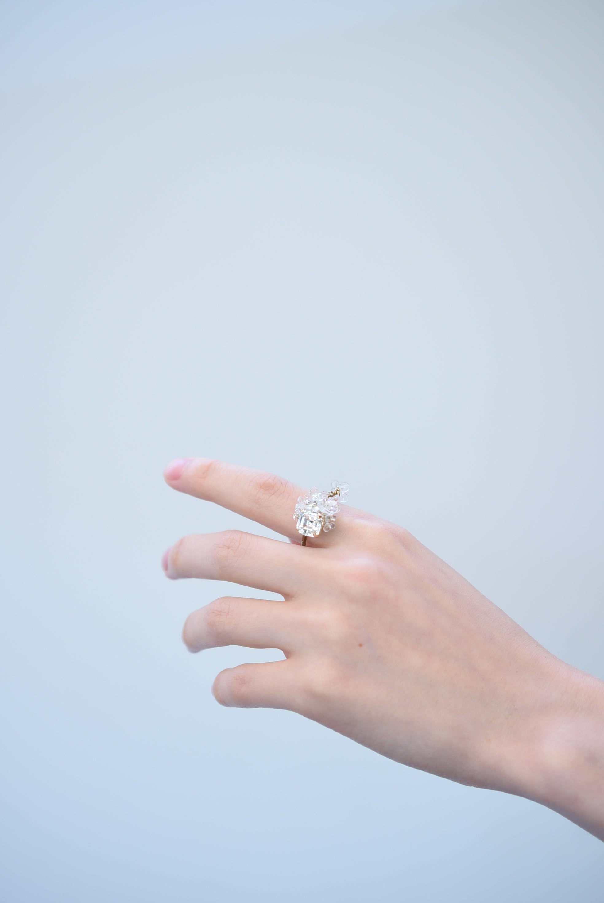 This is an Anabelle Ring. This ring is made with the Western hydrangea, Anabelle, as a motif. Each of these ring parts is very detailed, and it is composed of glass flowers made by glass craftsmen one by one, and very small beads. A single large stone is included, which is Swarovski glass. The center of the ring is open, so you can use it as a free-size ring. You can adjust it to the size of your finger by closing or expanding the ring.