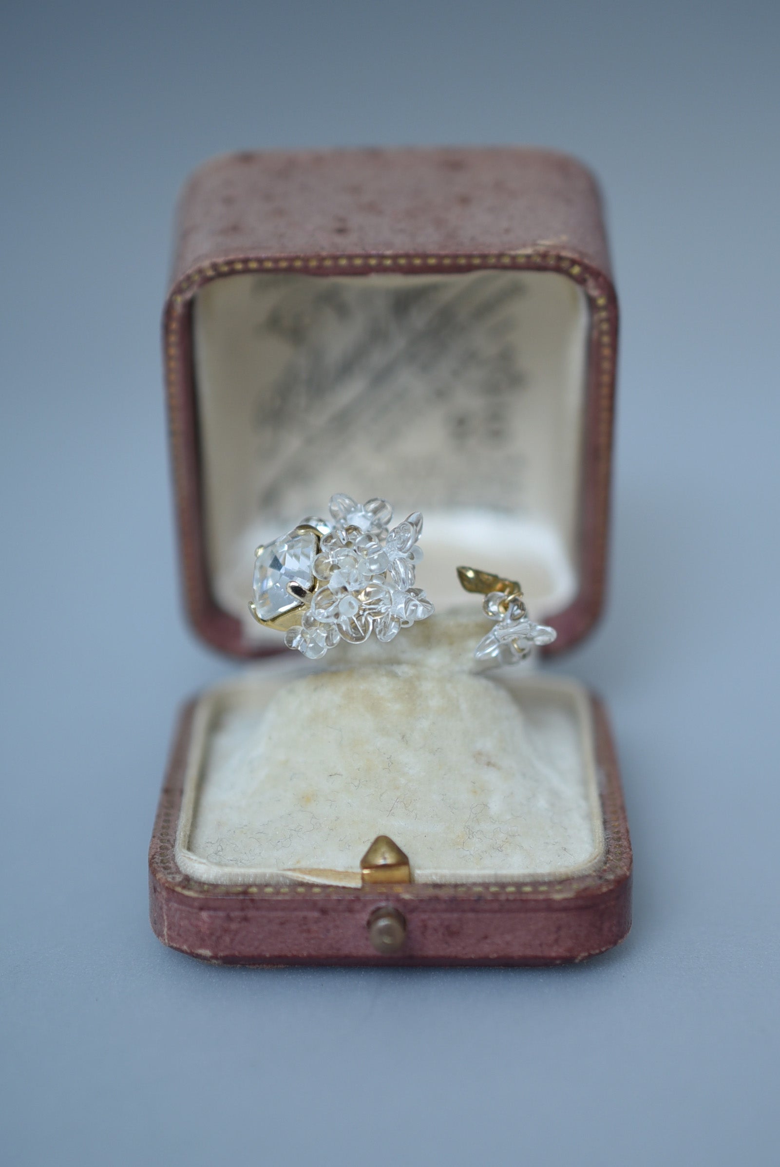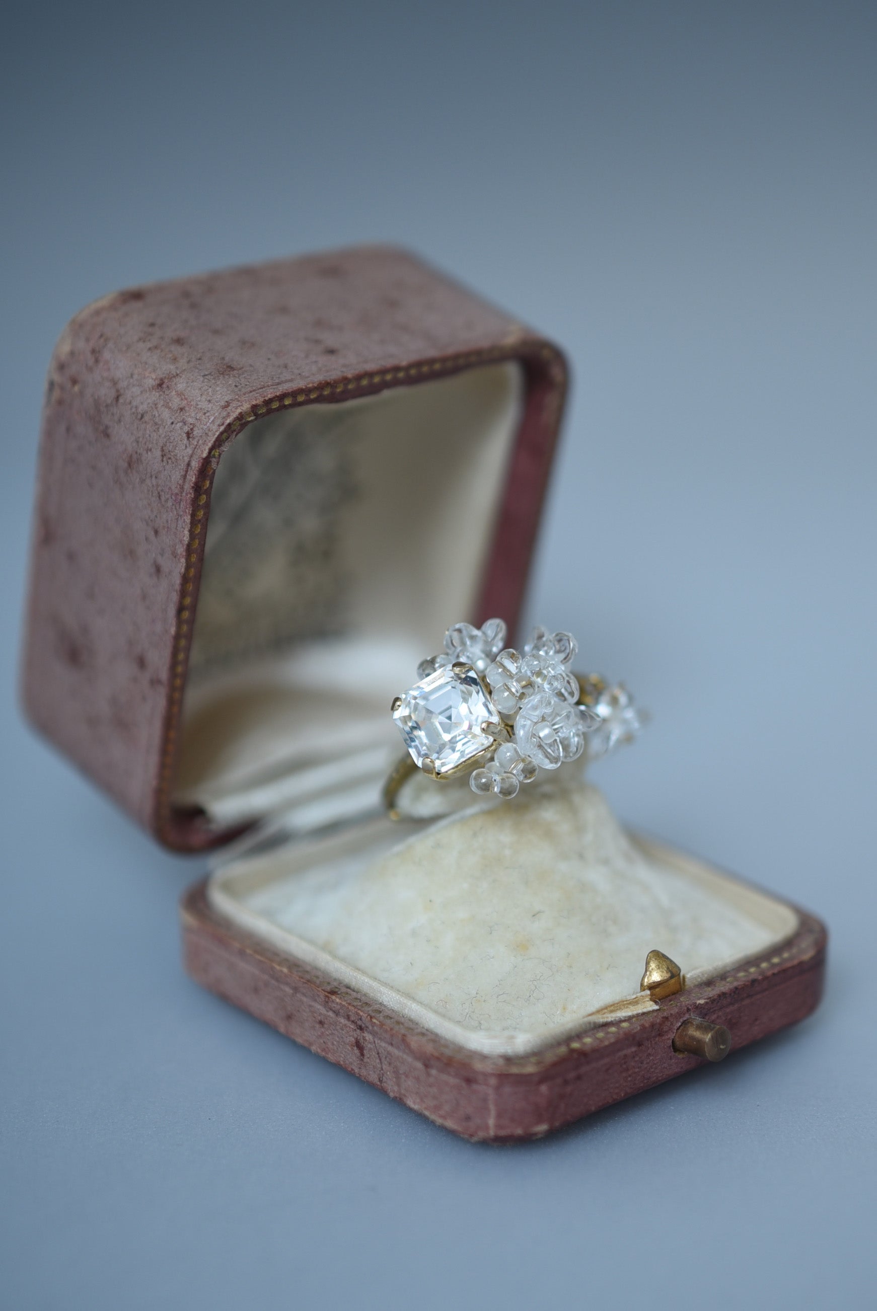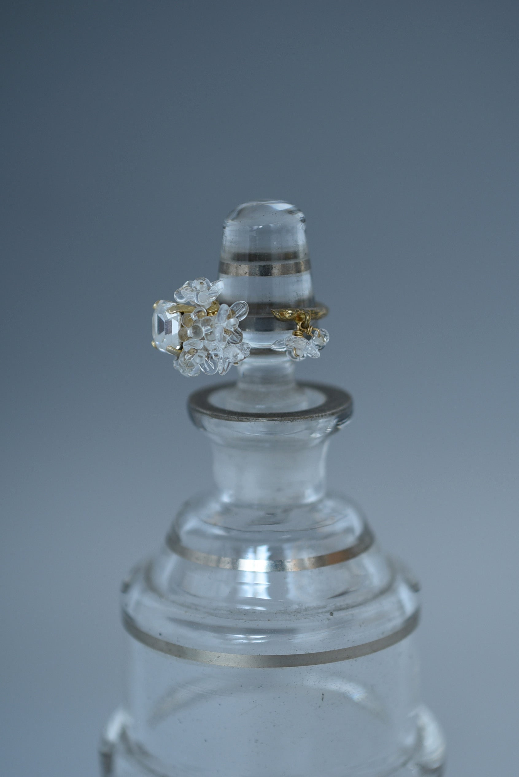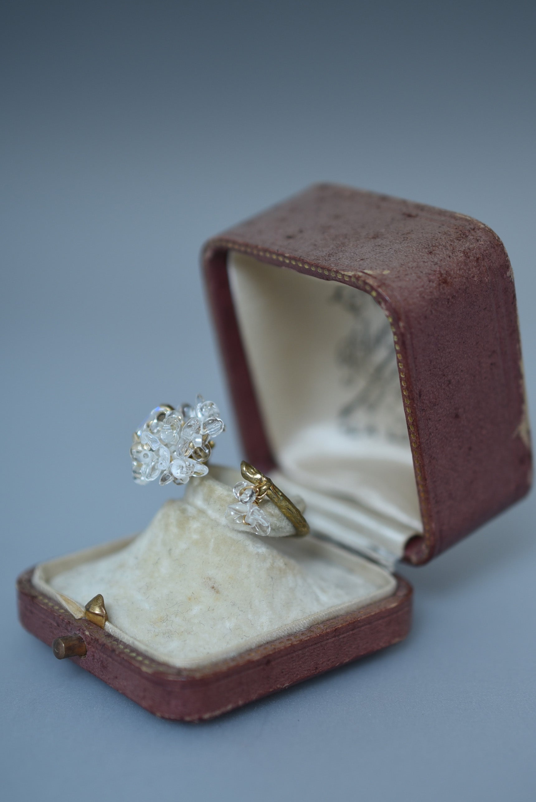 This is an Anabelle Ring. This ring is made with the Western hydrangea, Anabelle, as a motif. Each of these ring parts is very detailed, and it is composed of glass flowers made by glass craftsmen one by one, and very small beads. A single large stone is included, which is Swarovski glass. The center of the ring is open, so you can use it as a free-size ring. You can adjust it to the size of your finger by closing or expanding the ring.