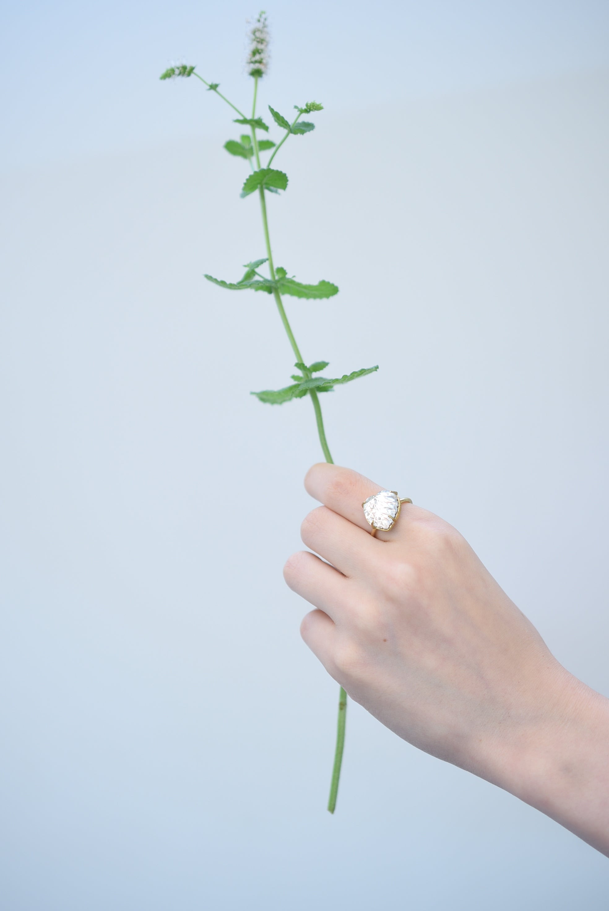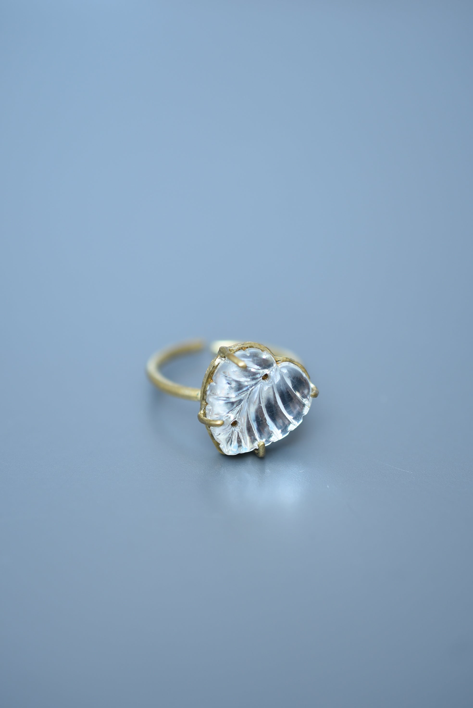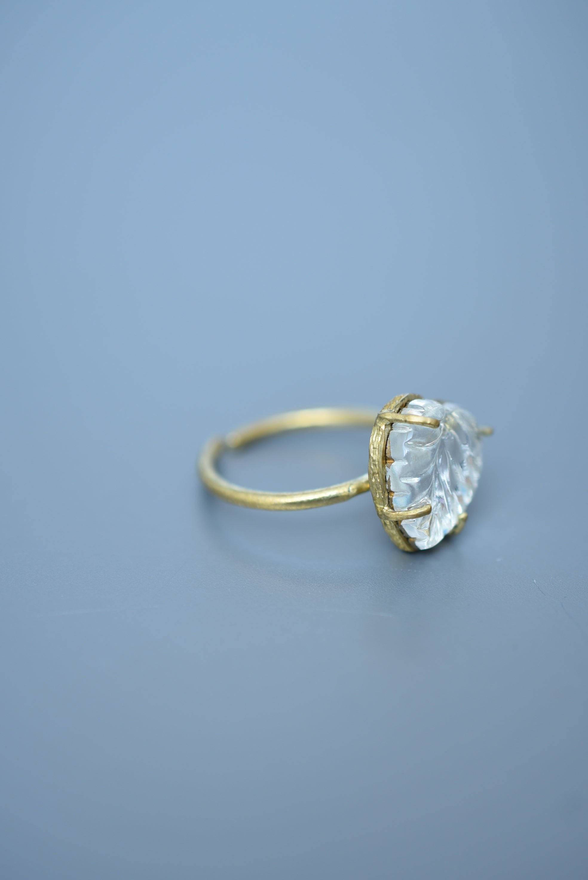 This is a Dogwood Ring. The glass motif on the top is German vintage glass, and the design is very beautiful. We use precious glass. This leaf looks just like a dogwood leaf, so I made it in the dogwood series. This is a free-size ring, so the back is open like this, so you can adjust it to your desired size. The sides of this ring also have a very antique atmosphere, and the design is very nice, so I want you to focus on the details as well.