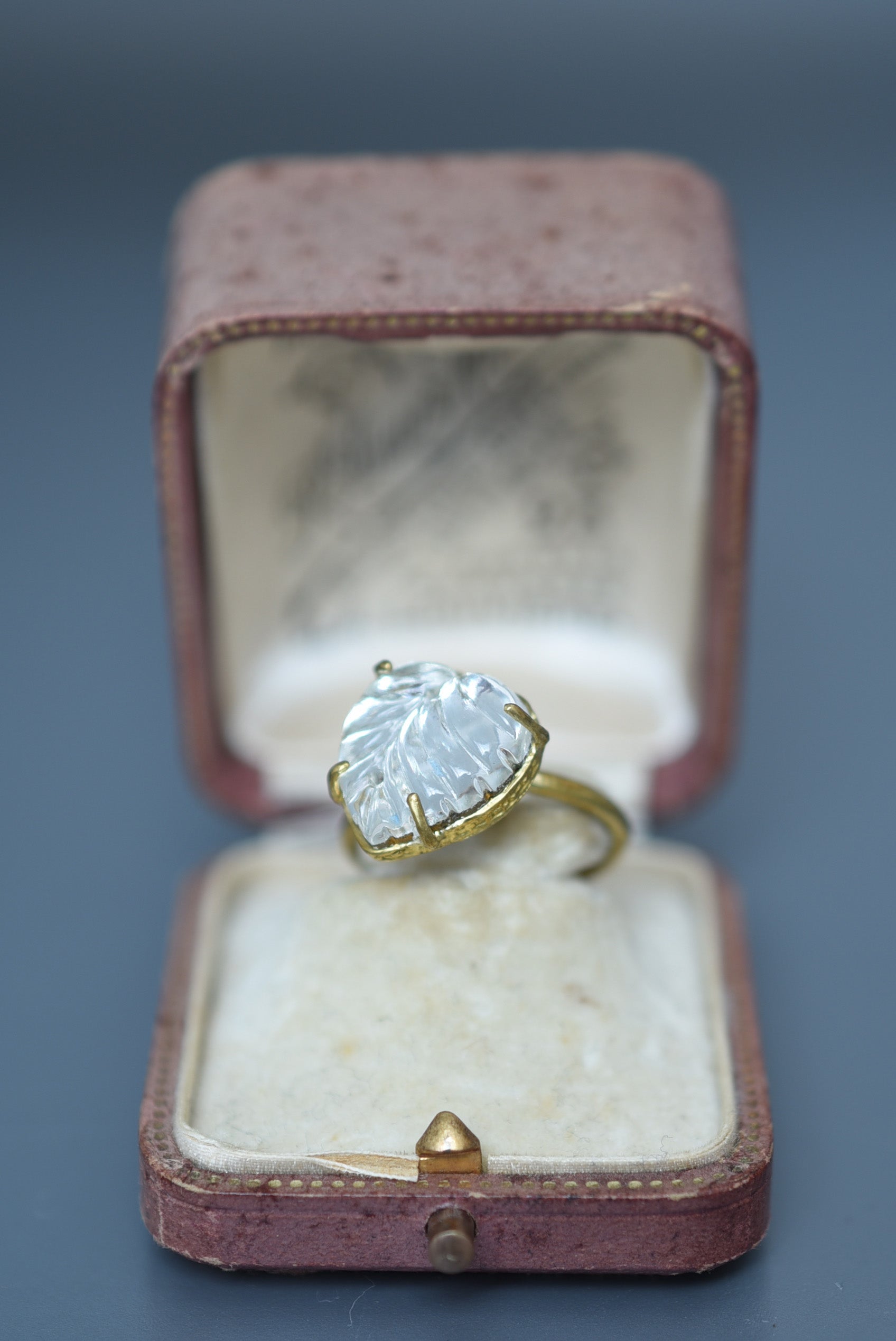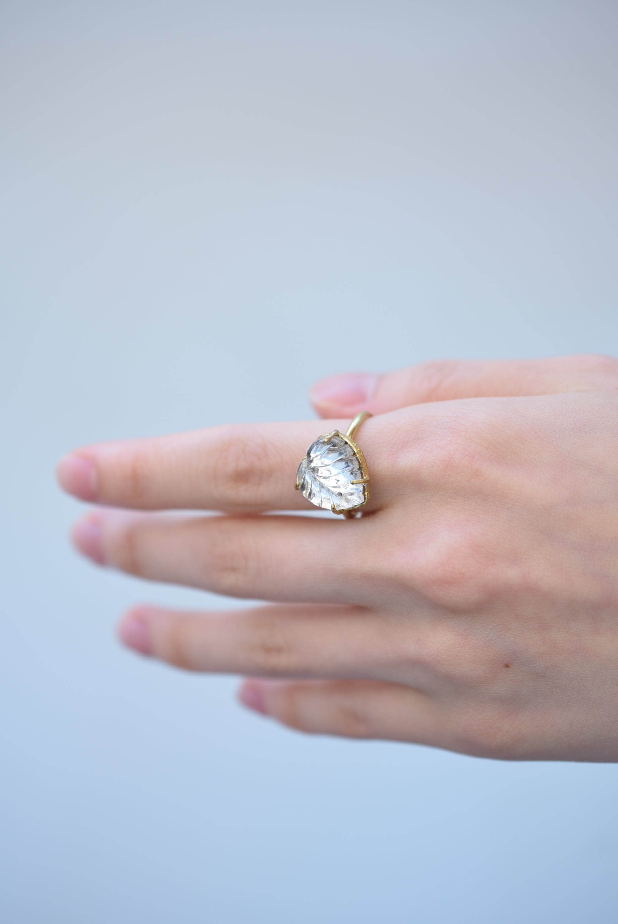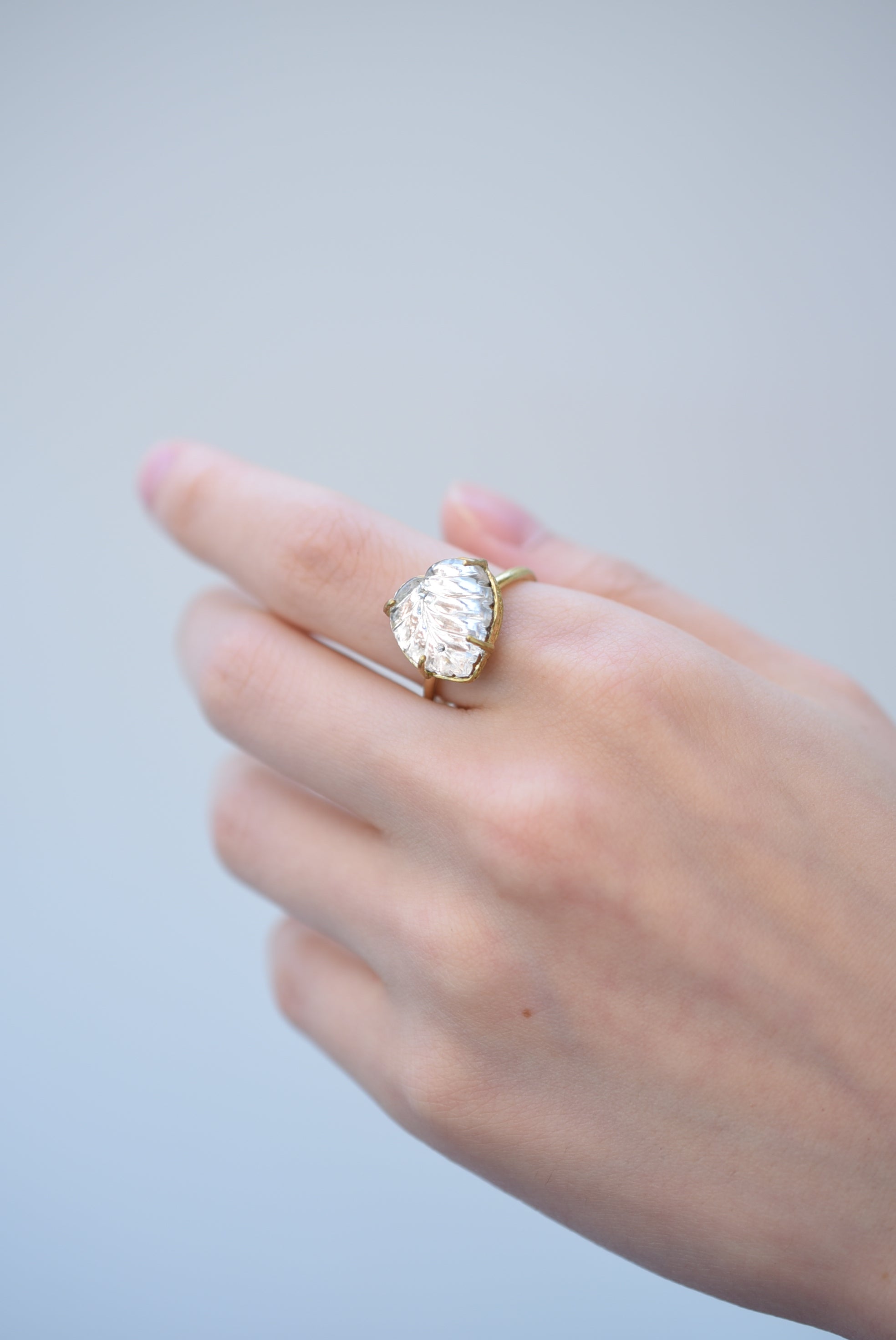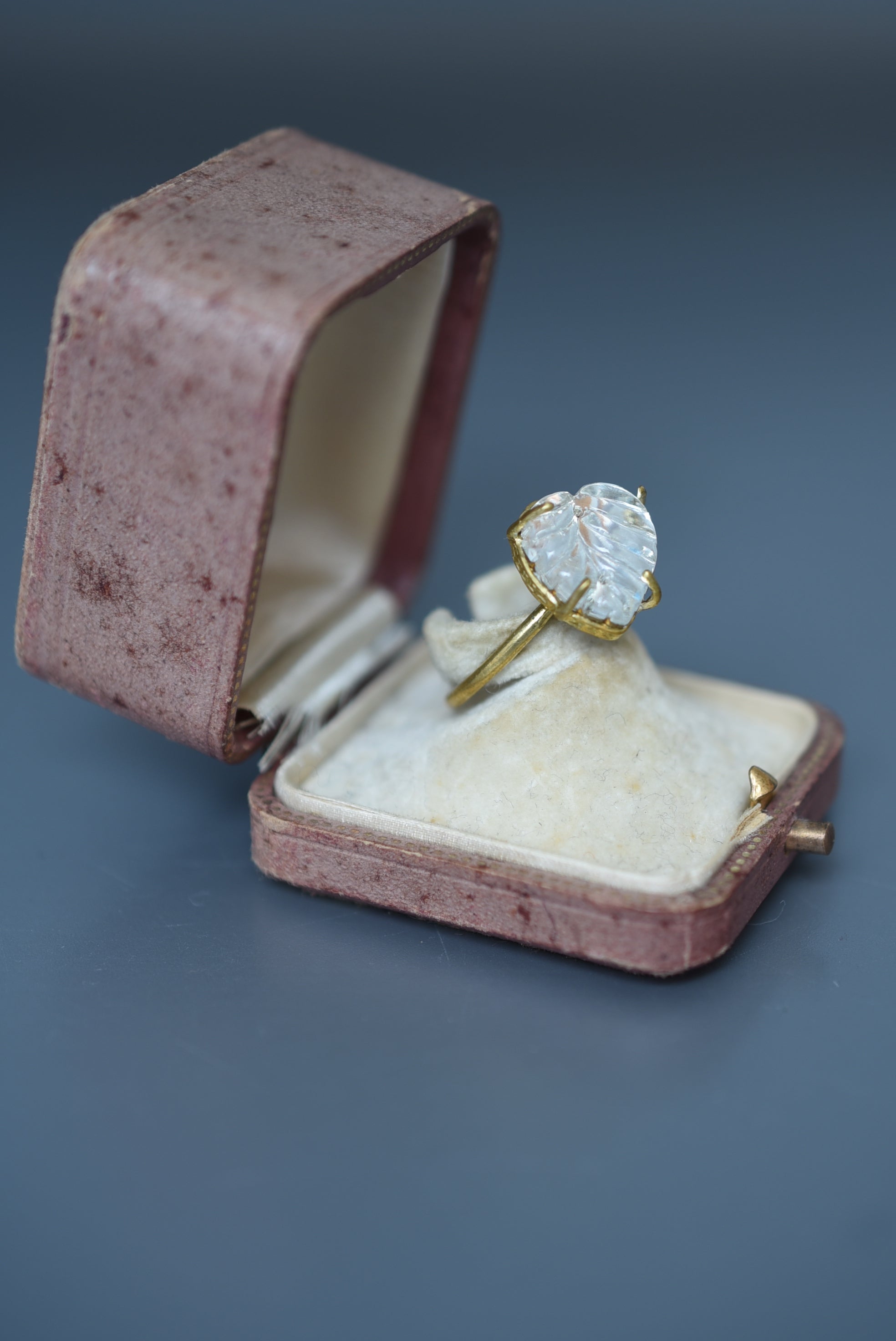 This is a Dogwood Ring. The glass motif on the top is German vintage glass, and the design is very beautiful. We use precious glass. This leaf looks just like a dogwood leaf, so I made it in the dogwood series. This is a free-size ring, so the back is open like this, so you can adjust it to your desired size. The sides of this ring also have a very antique atmosphere, and the design is very nice, so I want you to focus on the details as well.