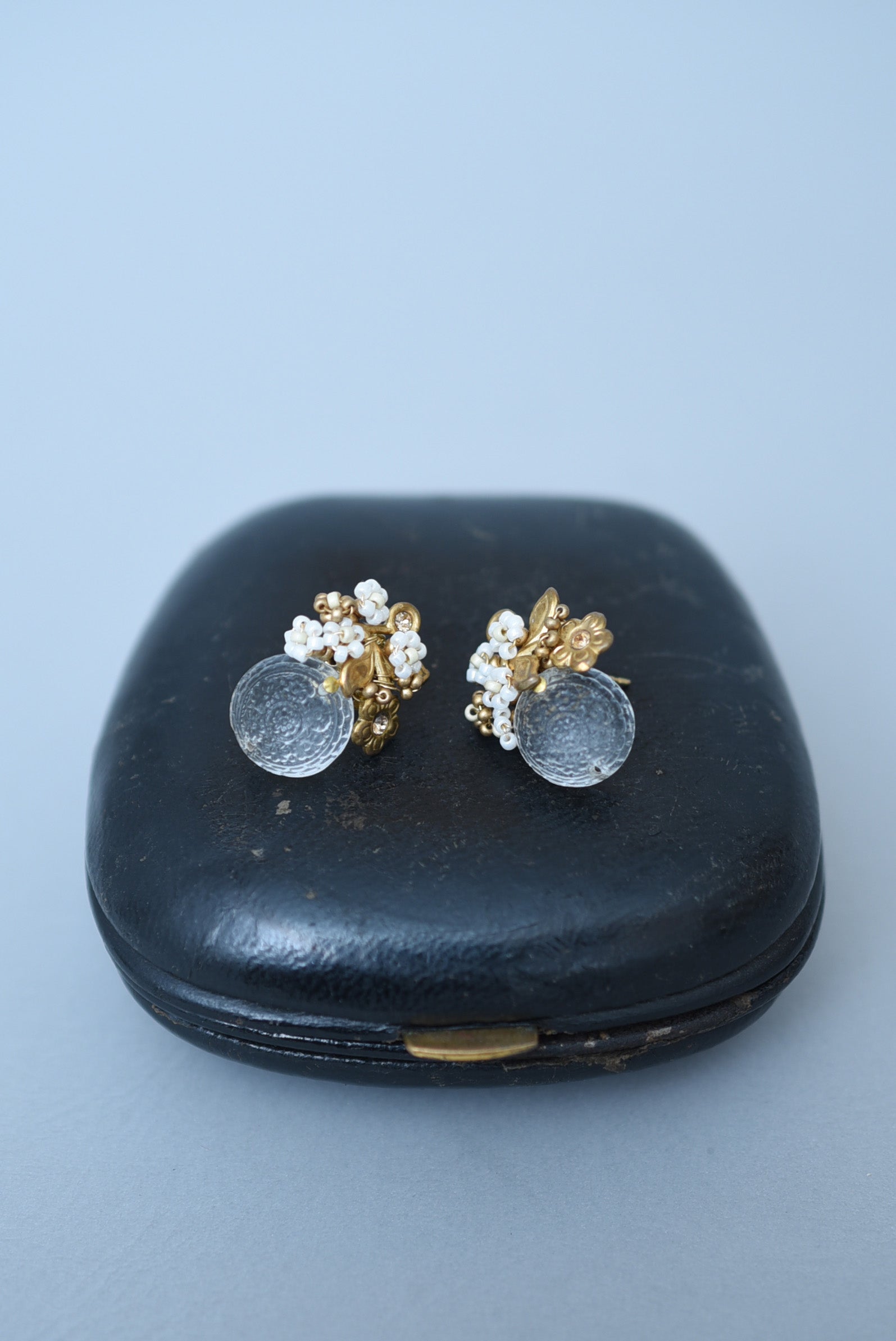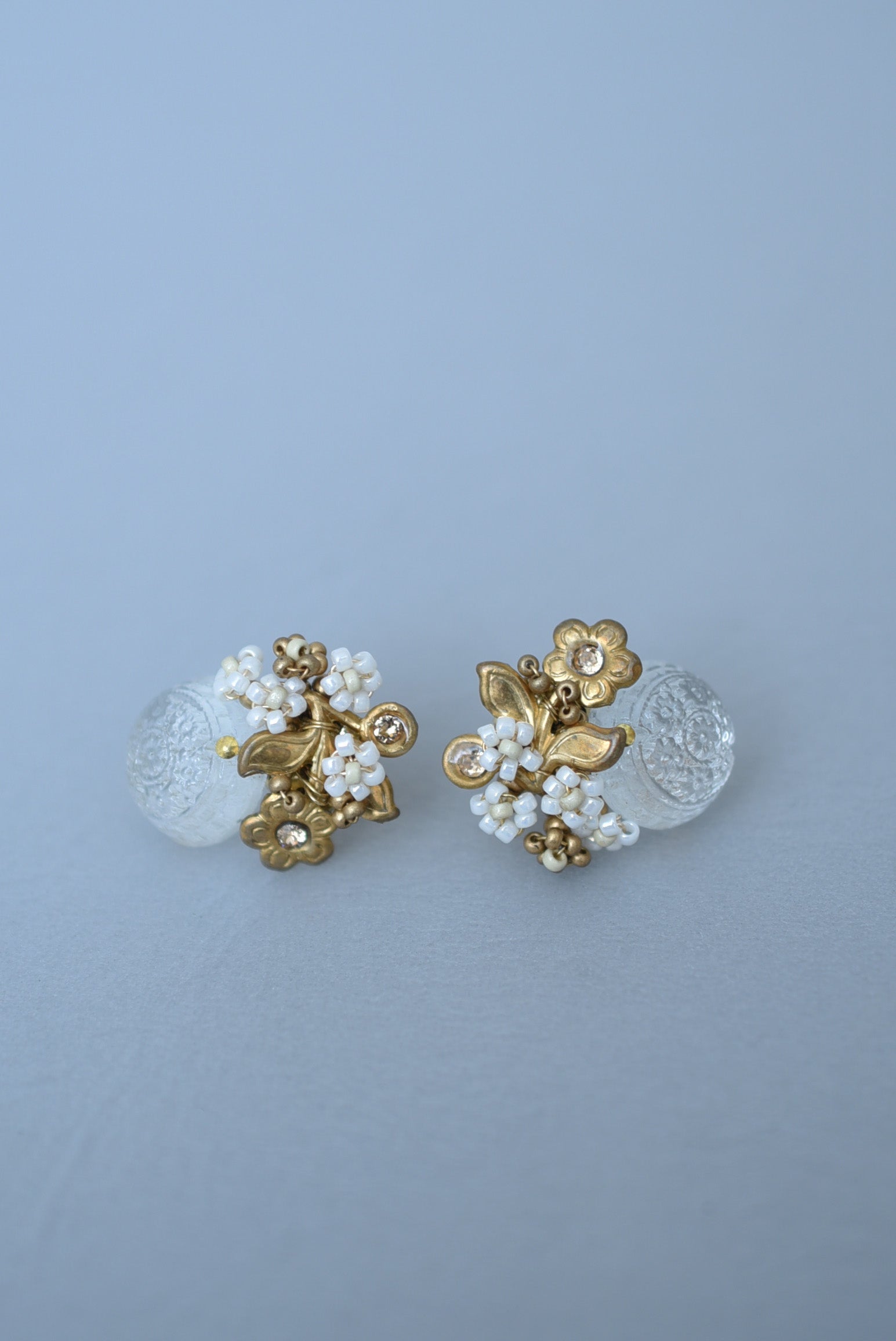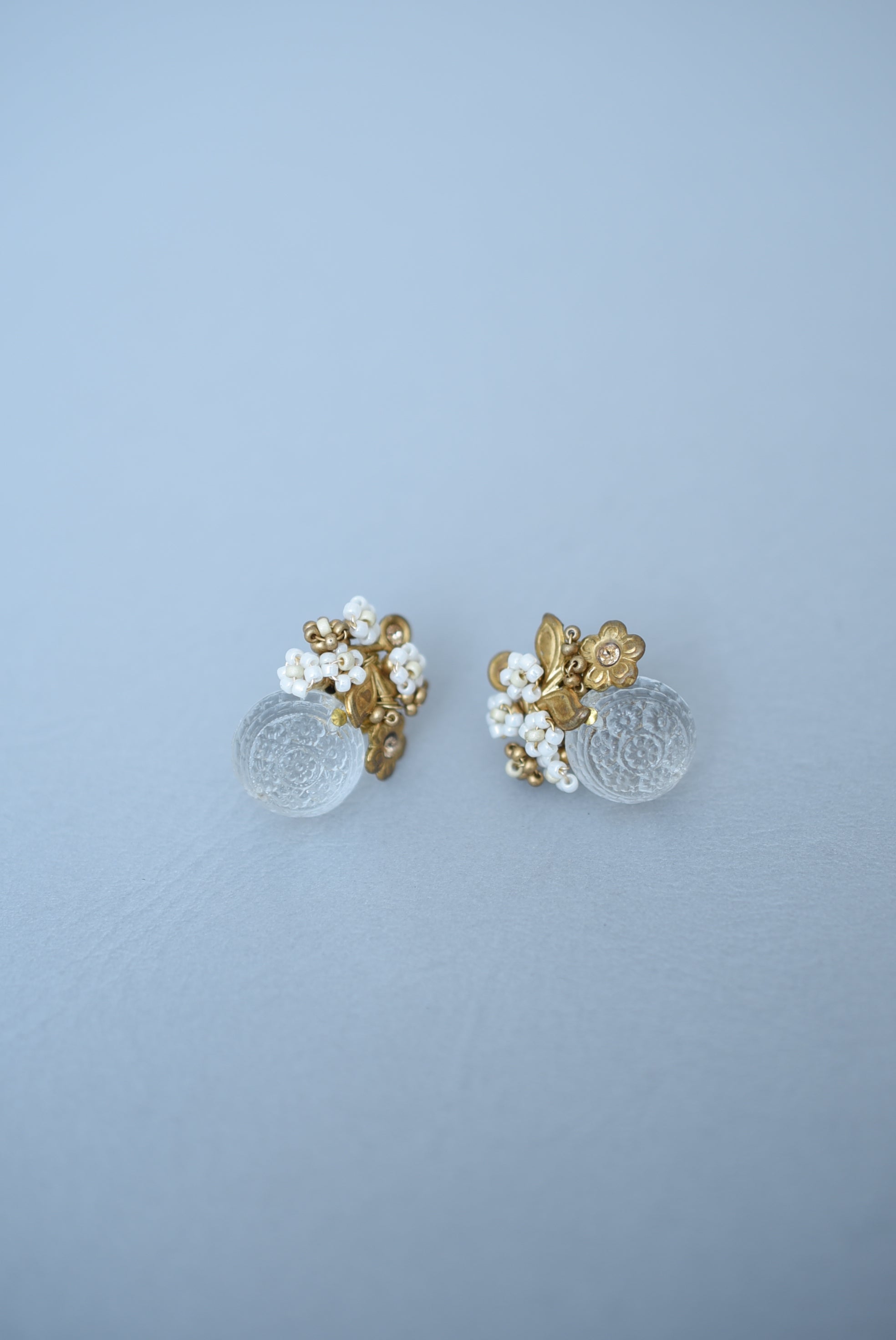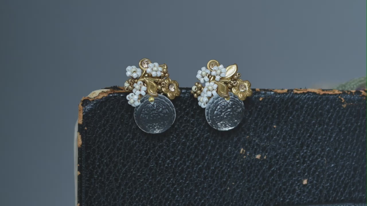 "These are Chamomile Glass Earrings. They are designed with the motif of chamomile herbs. These are truly delicately made earrings, with these small stamen made by weaving beads, and the glass part below is vintage French glass. The surface of the glass is also finely engraved with texture, and the design is very delicate, so I want you to focus on that as well. Earrings are also available.