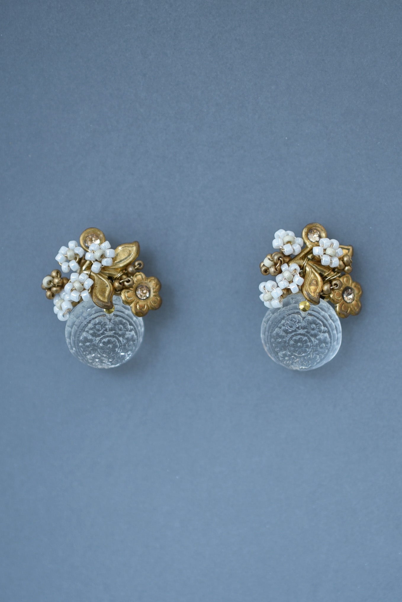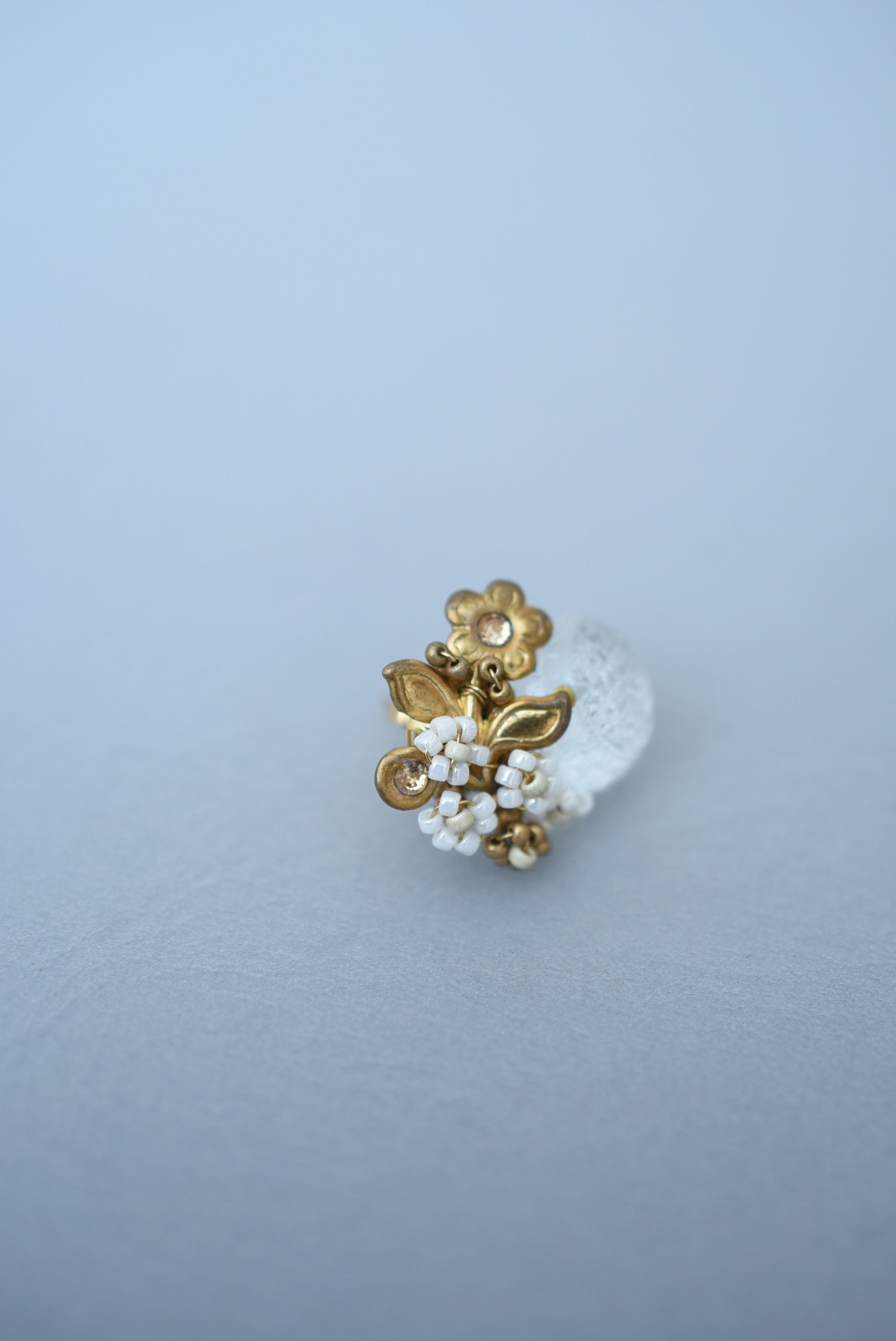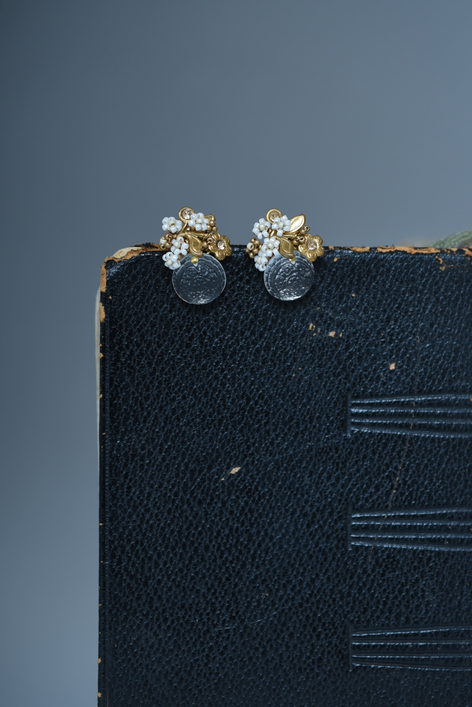 "These are Chamomile Glass Earrings. They are designed with the motif of chamomile herbs. These are truly delicately made earrings, with these small stamen made by weaving beads, and the glass part below is vintage French glass. The surface of the glass is also finely engraved with texture, and the design is very delicate, so I want you to focus on that as well. Earrings are also available.